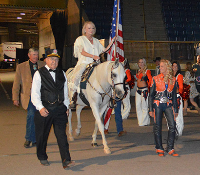 Rider and trainer Ann Judge has saddled-up Thunder I, II and III. Together, adorned in blue and orange, the duo adds full-speed elegance to the hard-nosed game of football. Judge commands the scoring sprint while waving a flag and saluting the crowd…yes, all without holding onto the reigns. This ceremonial full-field run signifies a Bronco scoring drive.