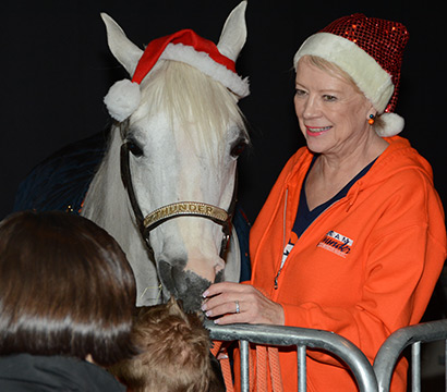 Off the field, Thunder’s connection to the community helps support local charities. Through Sharon’s involvement in diverse nonprofit efforts, Thunder has been a special guest to benefit organizations like Children’s Hospital, Denver Rescue Mission and the American Heart Association and Western Fantasy. As co-founder, this remains the pinnacle event and Sharon’s favorite night out with Thunder. The evening begins with Denver’s most distinct opening tribute. Sharon explains it this way. “Thunder III and I ride around a hundred and twenty tables full of guests who love seeing the mascot up close and personal. We bring the American flag in to Lee Greenwood’s God Bless the USA. Thunder is perfect.”