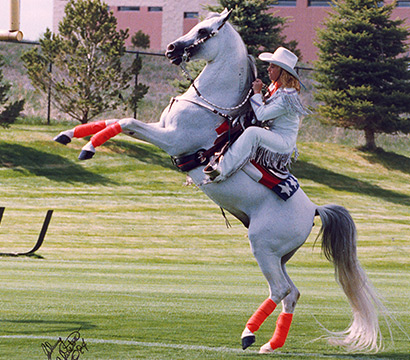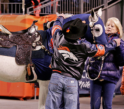 Three purebred Arabians have been cast in the mascot role that debuted on September 12, 1993, a Bronco victory over the San Diego Chargers. “To me,” owner Sharon Magness Blake says, “Arabians have so much presence, and when you get close to them, you can see their intelligence and kindness.”