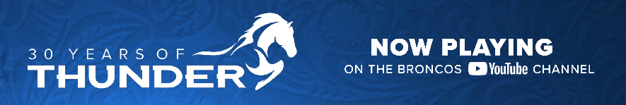 Winning multiple show champion awards, Sharon explains that the first Thunder was a stallion. “He was smart – a lovable handful with a hilarious sense of humor.” Thunder I led the Bronco charge during the inaugural ten seasons and represented the team during Elway-led wins in Super Bowls XXXll and XXXlll. Thunder II, a gelding nicknamed “Dos”, rode as the mascot through the 2012 season. Thunder III also known as “Shadow” was appointed with mascot duty and has led the Broncos onto the field in Super Bowls XLVlll and 50. Thunder IV took over in 2021.