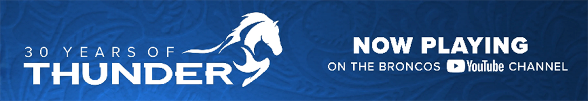Rider and trainer Ann Judge has saddled-up Thunder I, II, III and IV. Together, adorned in blue and orange, the duo adds full-speed elegance to the hard-nosed game of football. Judge commands the scoring sprint while waving a flag and saluting the crowd … yes, all without holding onto the reigns. This ceremonial full-field run signifies a Bronco scoring drive.